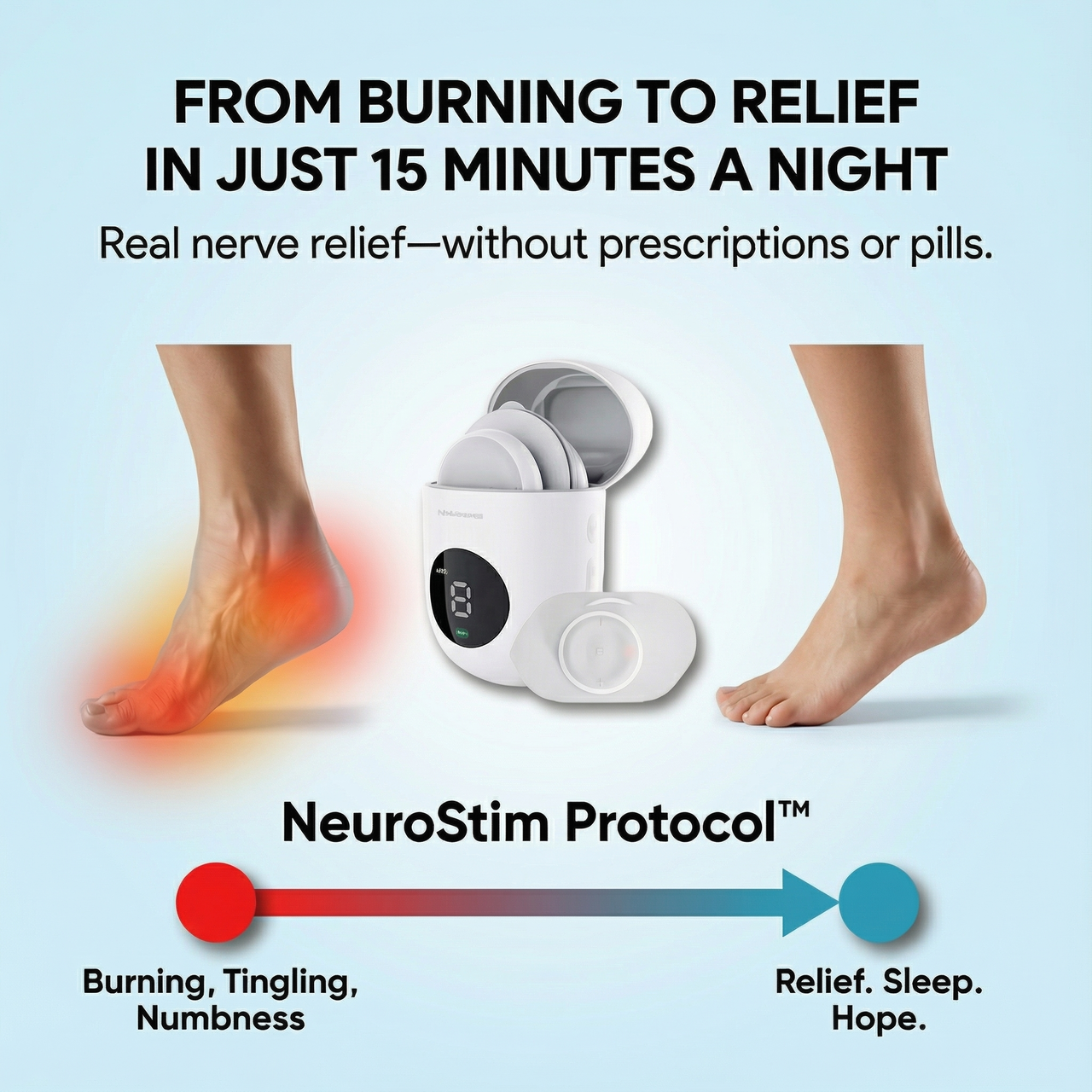 Try NeuroStim for 120 days. Use it every night. Feel your nerves respond during the first session. Feel the burning ease by week 2. Sleep through the night by week 4.