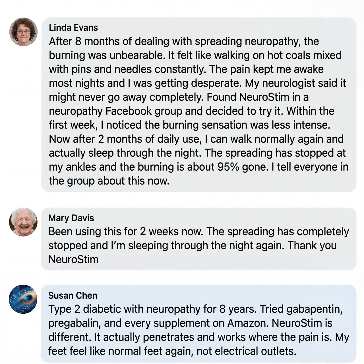 “My mother's neuropathy spread to her calves in six months. Nothing worked. Got her NeuroStim. Spreading stopped week six. Fourteen months later, still stopped. I've recommended it to forty patients since.”